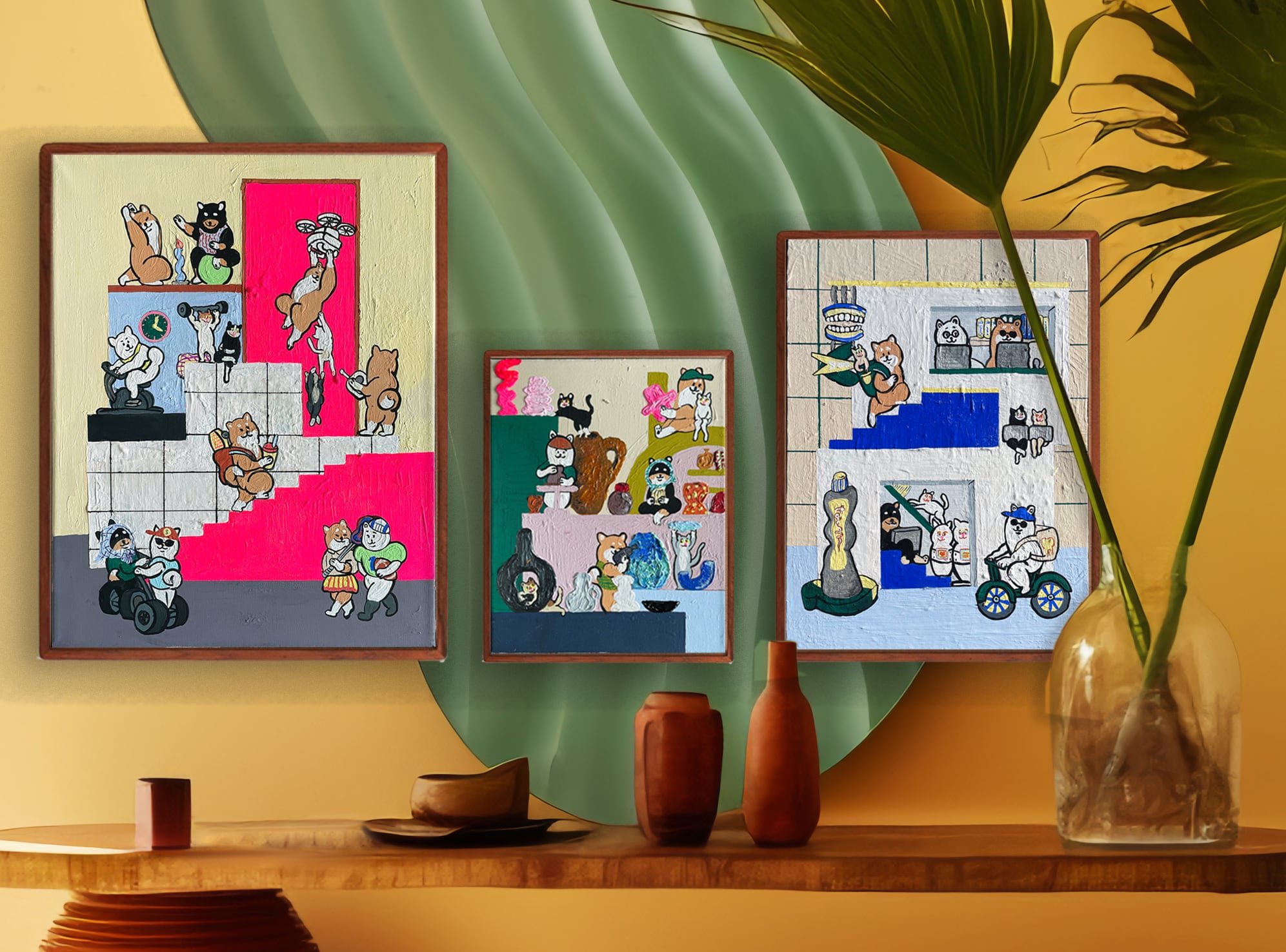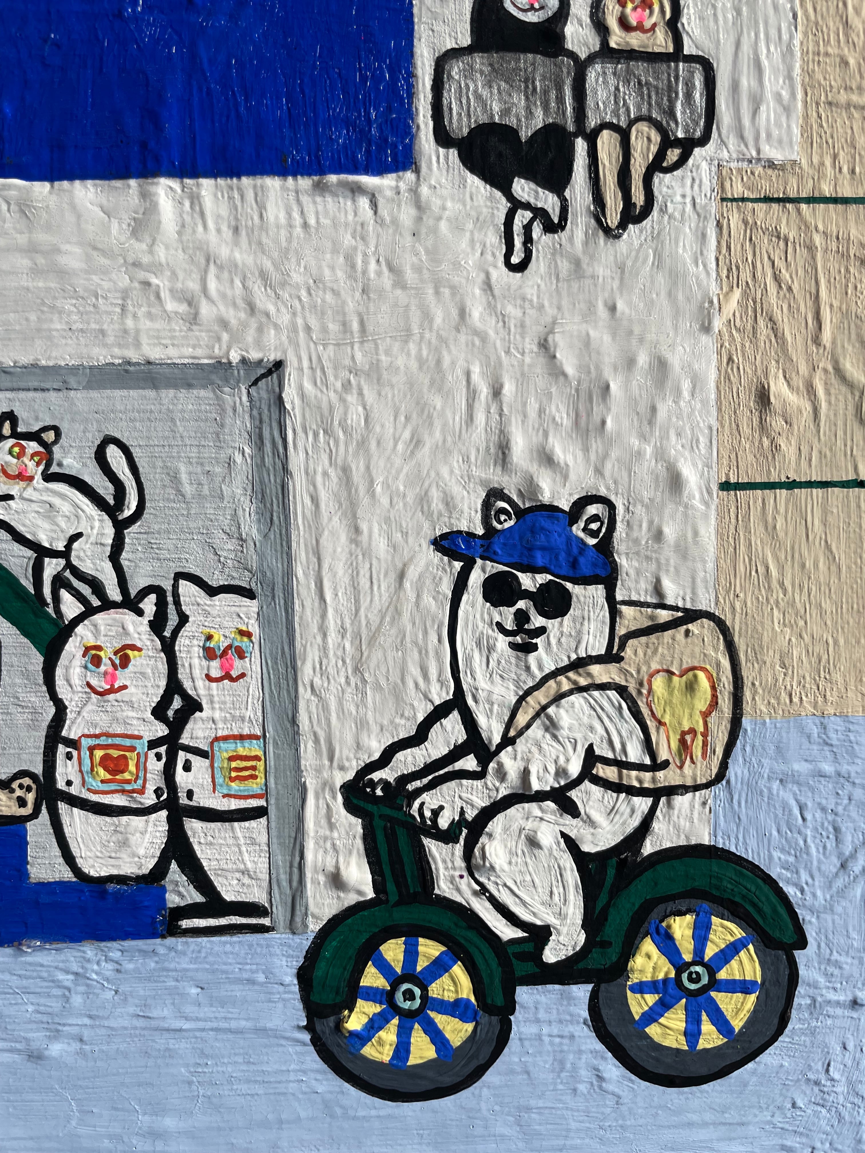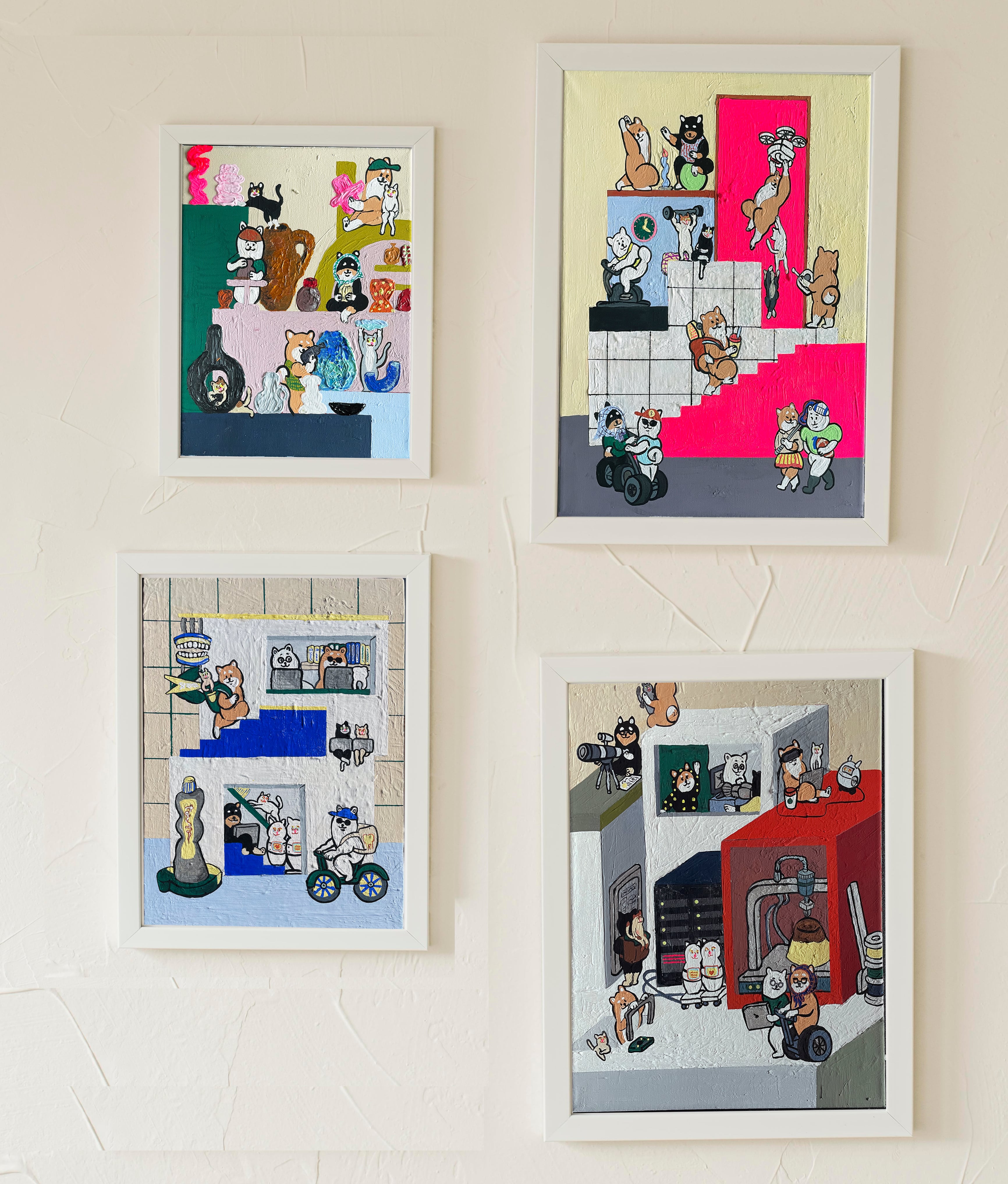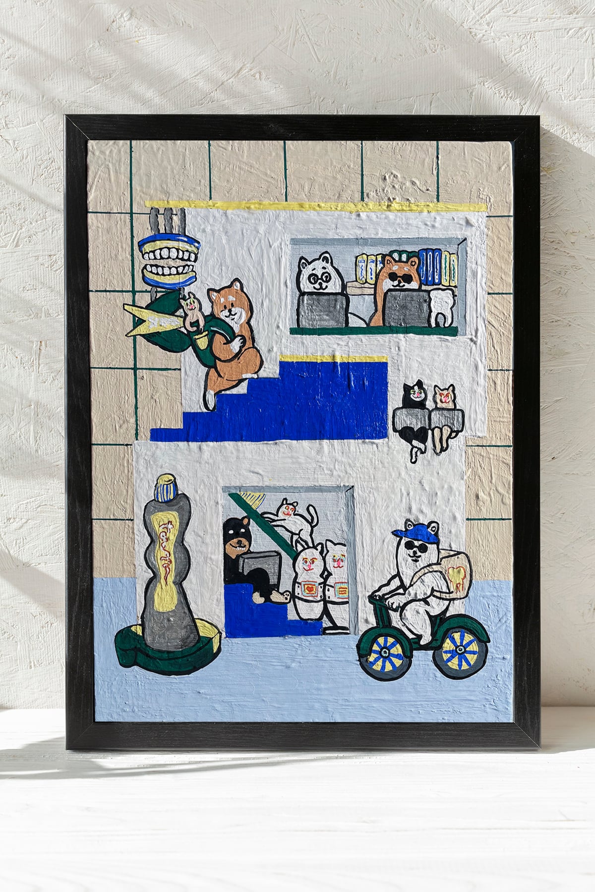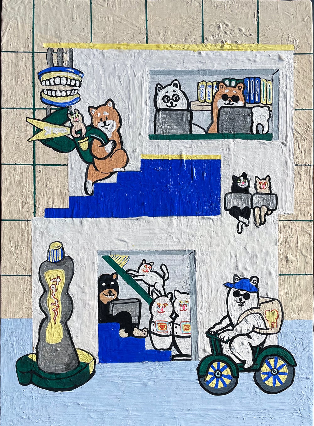 ホワイトの建物部分は艶出しのアクリルメディウムを使用しており、光沢感があります。