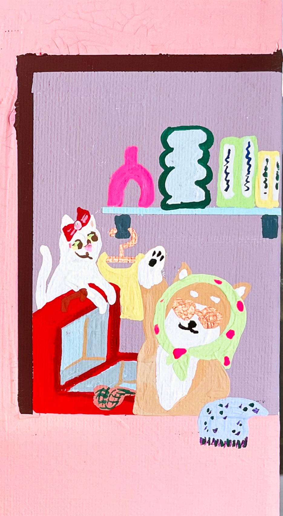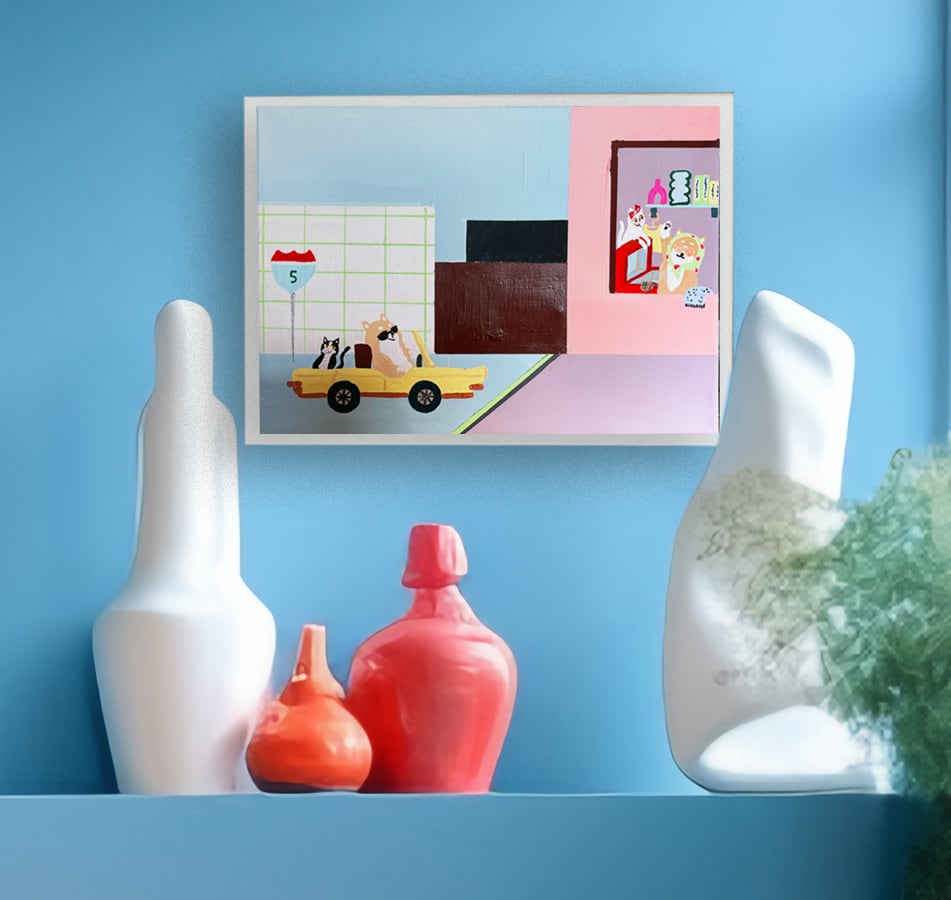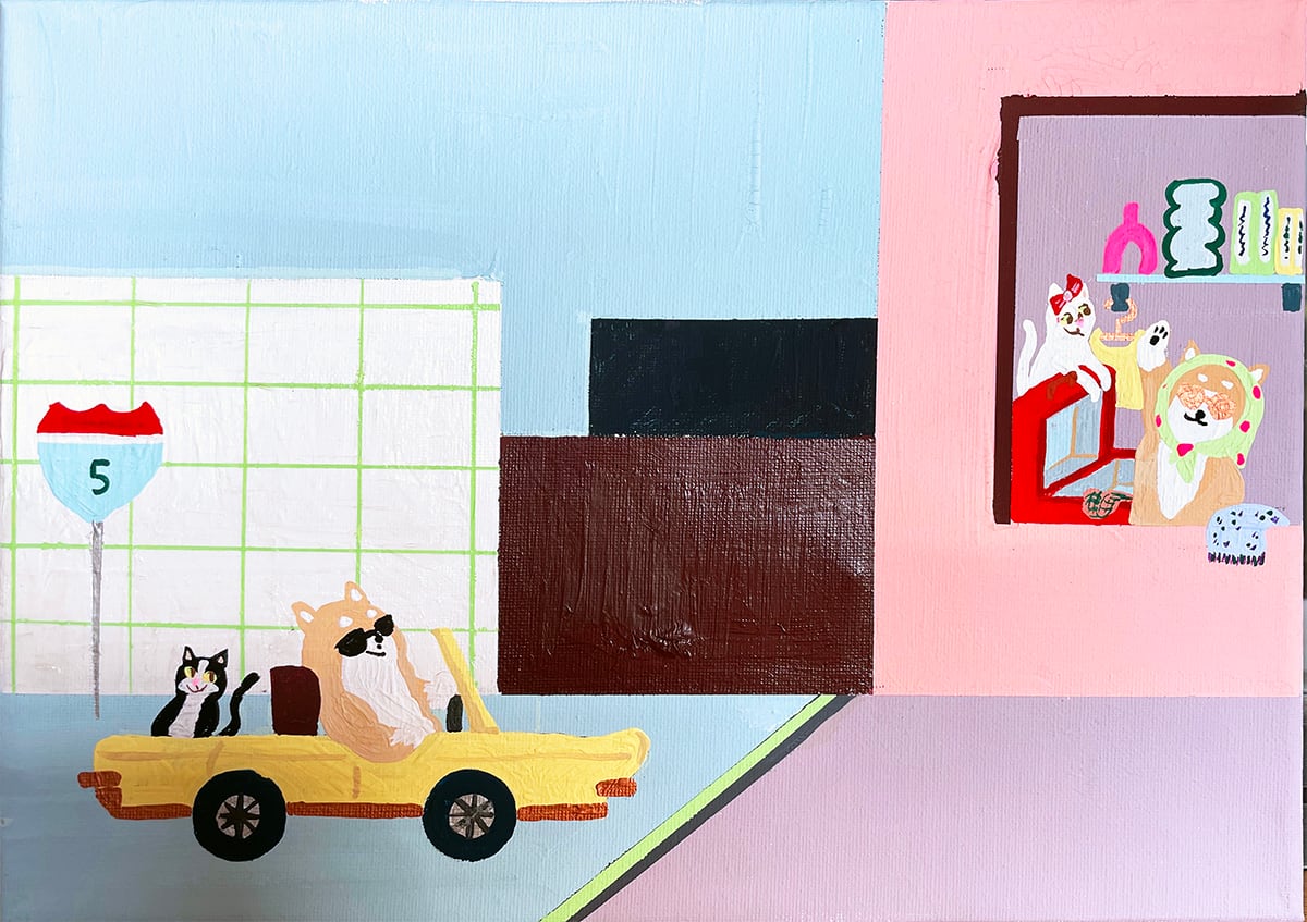 ふたりは友人の猫を連れてドライブをした後に、チーズが美味しいハンバーガーを食べる予定です。F4号(332mm×242mm)・アクリル画です。写真とは異なりますが仮額付きで郵送します。