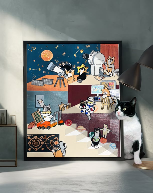 ここは、月が一番近い場所にある天体研究所。いまにも星が降ってきそうな夜ですが、柴犬の研究者達は今日も変わらず星や銀河などの宇宙現象の謎を解明するため、月と星の観測をしています。物理学や数学を得意とする柴犬研究者ですが、それぞれの得意な分野があることを承知しているので、お互いの研究内容に干渉はしません。そんなところも柴犬らしいですね。