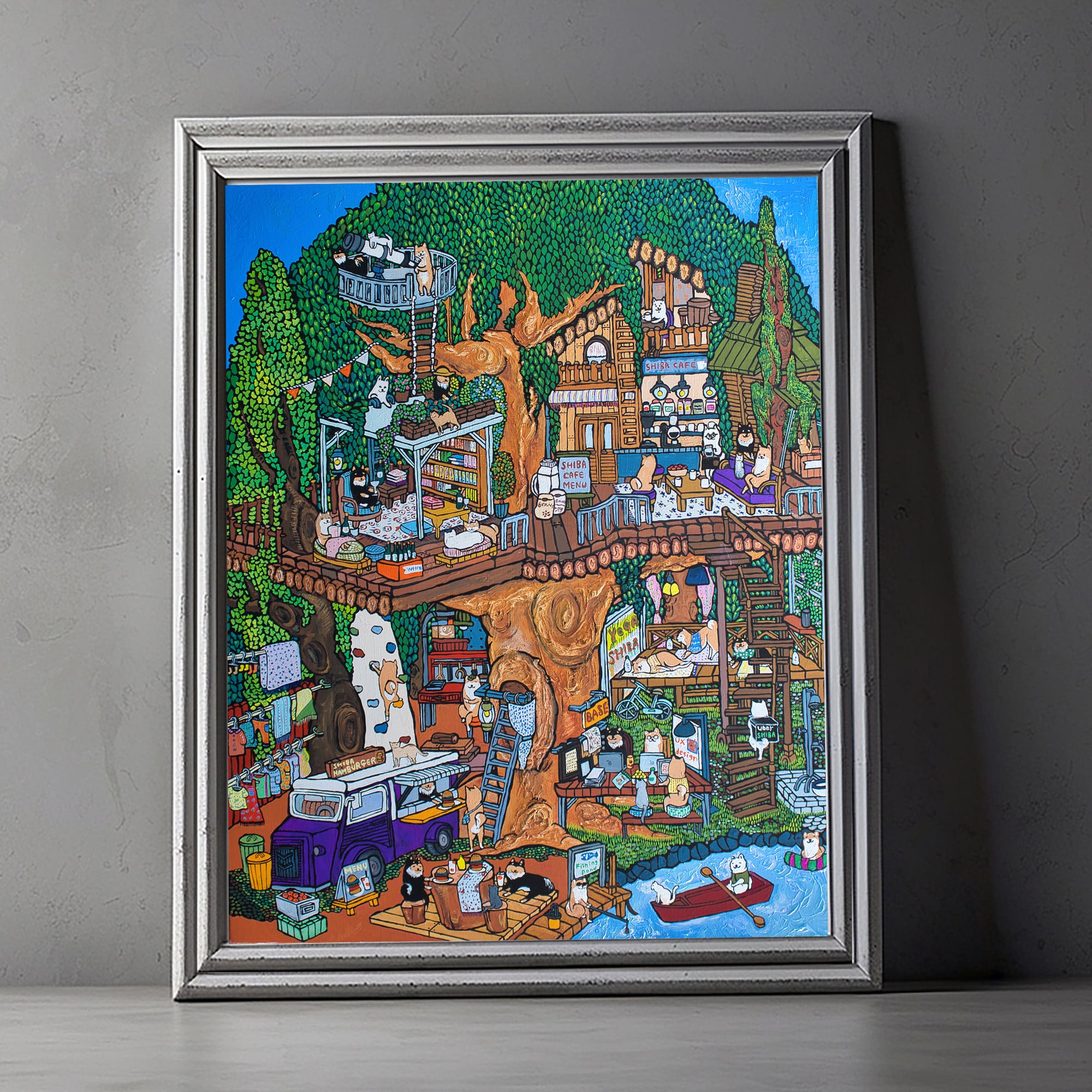 【作品紹介】25匹の柴犬と8匹の猫が集まるツリーハウスの秘密基地「SHIBA BASE」を描きました。