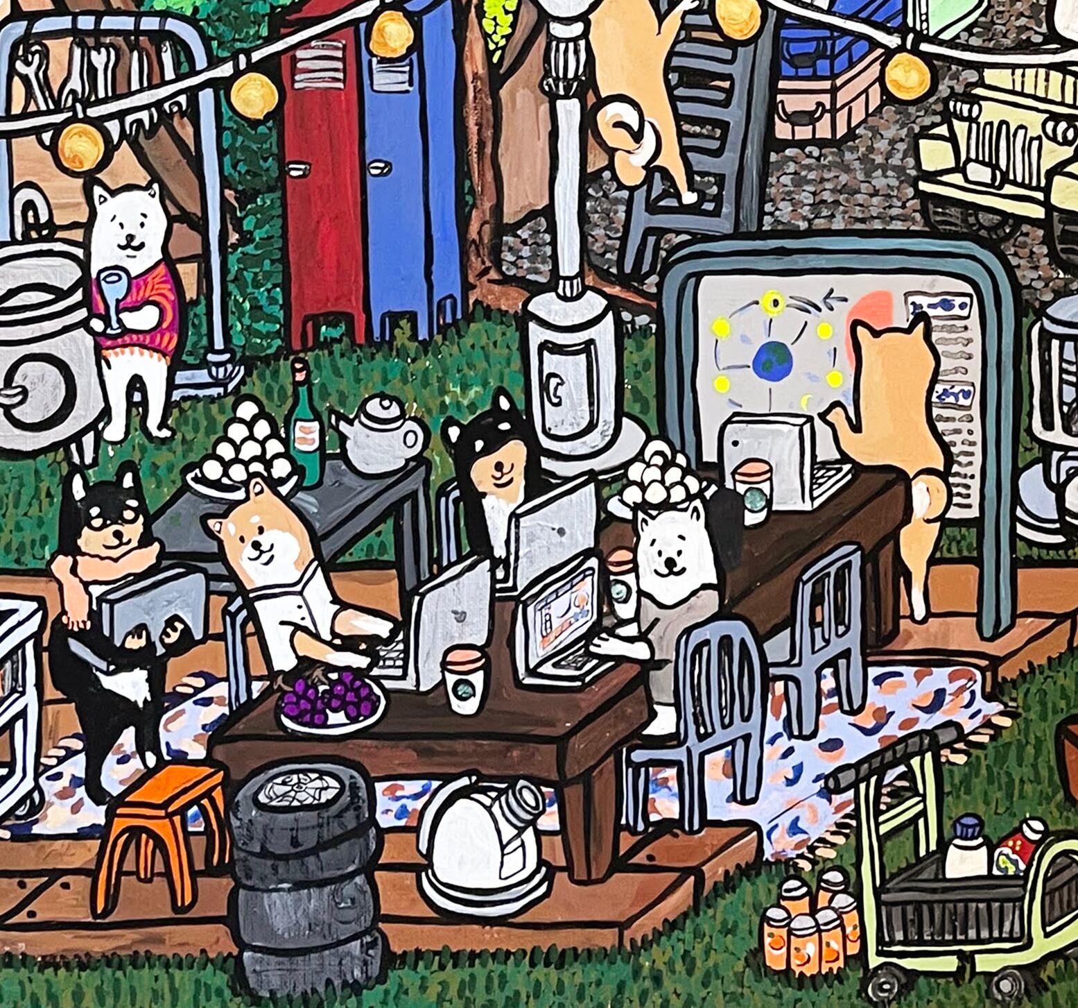 お月様を事を観察したり、研究したりしている柴犬達は、そろそろ仕事を終えてひと休みするか、とみんなで声を掛け合いパソコンを閉じます。今夜も月と一緒に過ごすゆるっと優しく不思議な時間が始まります。
