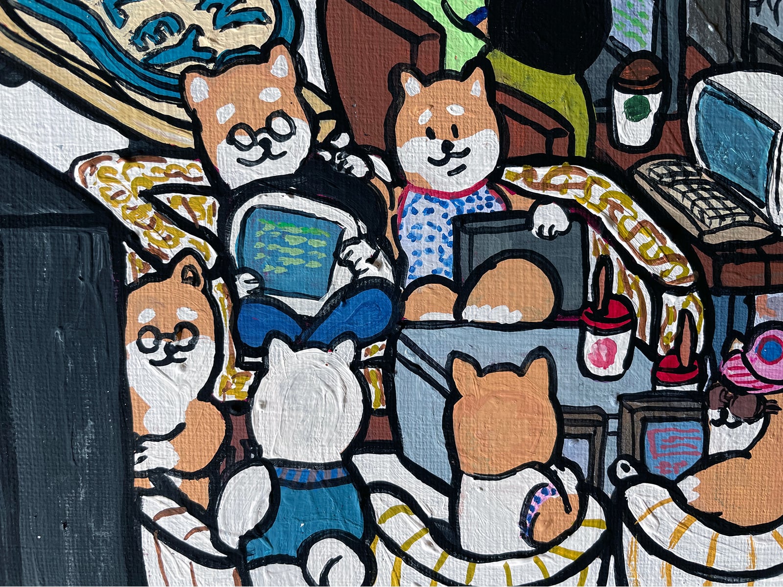 SOLD OUT シリコンバレーの伝説的な企業のいくつかは、ガレージで始まったことで有名だ。ここは画期的なアイデアを持つ柴犬達が集うガレージ。この家は1階建ての平屋で真ん中に玄関があり向かって左側にガレージがある。テクノロジーやアートといった言葉に縛られないオルタナティブな物語がこのガレージと柴犬から始まる。F6号(410mm×318mm)・アクリル画です。写真とは異なりますが仮額付きで郵送します。