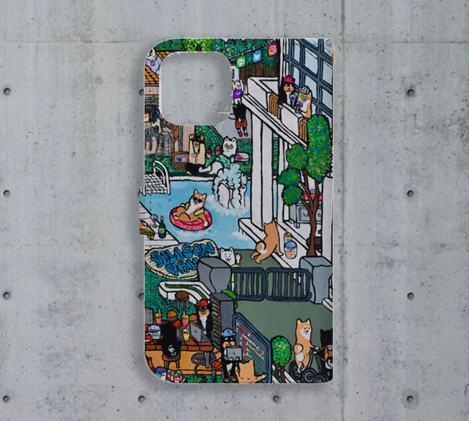 シリコンバレーの柴犬達と大正浪漫柴の絵柄をプリントした手帳型iPhoneケースです。